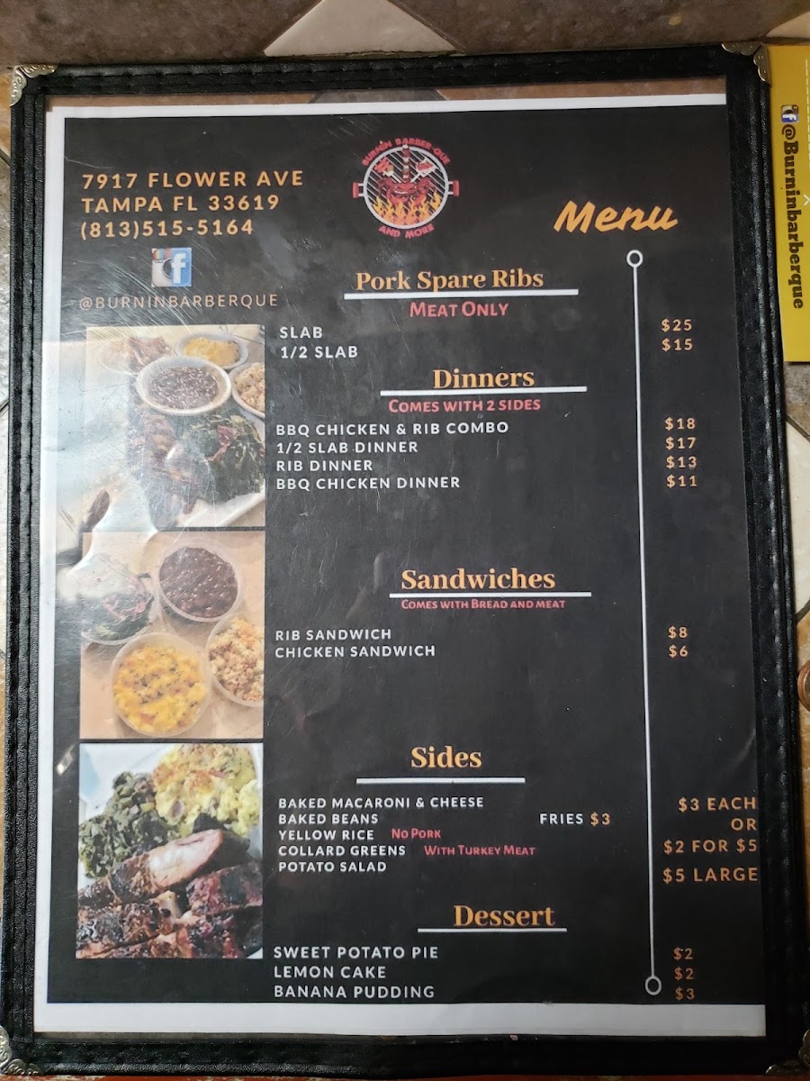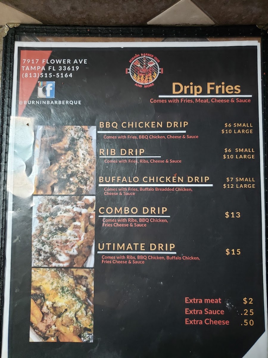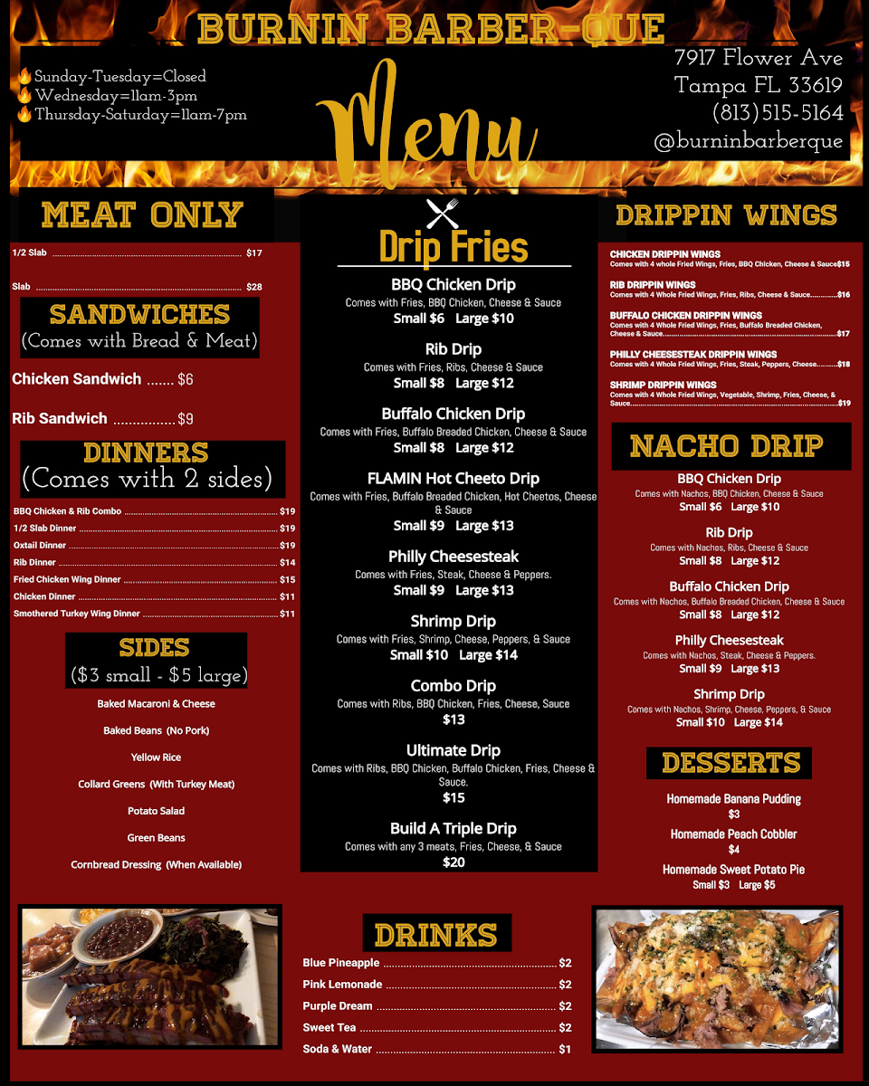 When you're craving bold flavors and mouthwatering barbecue, look no further than Burnin' Barber-Que & More Menu. Located at 7917 Flower Ave in Tampa, FL, this spot is all about big, satisfying plates that pack a punch. Whether you're in the mood for a classic smoked brisket, juicy ribs, or something unique, you'll find it here. The menu has something for everyone - from savory sides to fiery sauces that add that perfect kick. If you're looking for a laid-back meal with hearty portions and flavors that hit the spot every time, Burnin' Barber-Que is the place to be. Make sure to try some of the fan favorites and get ready for a flavor experience that’s sure to leave you coming back for more.