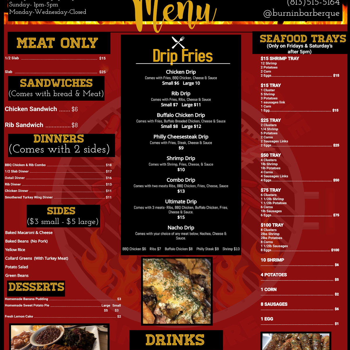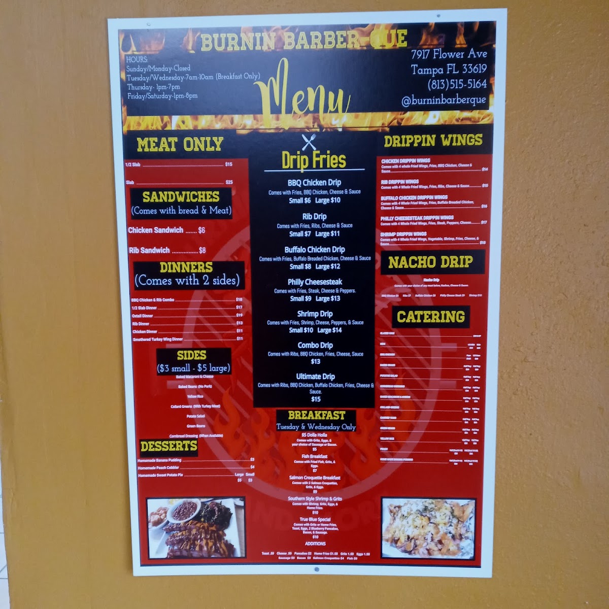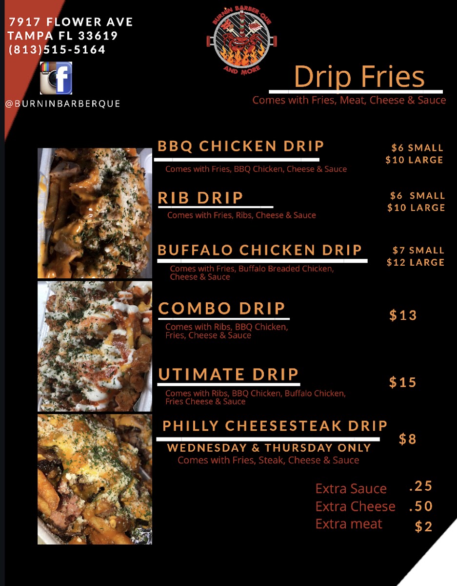 When you're craving bold flavors and mouthwatering barbecue, look no further than Burnin' Barber-Que & More Menu. Located at 7917 Flower Ave in Tampa, FL, this spot is all about big, satisfying plates that pack a punch. Whether you're in the mood for a classic smoked brisket, juicy ribs, or something unique, you'll find it here. The menu has something for everyone - from savory sides to fiery sauces that add that perfect kick. If you're looking for a laid-back meal with hearty portions and flavors that hit the spot every time, Burnin' Barber-Que is the place to be. Make sure to try some of the fan favorites and get ready for a flavor experience that’s sure to leave you coming back for more.